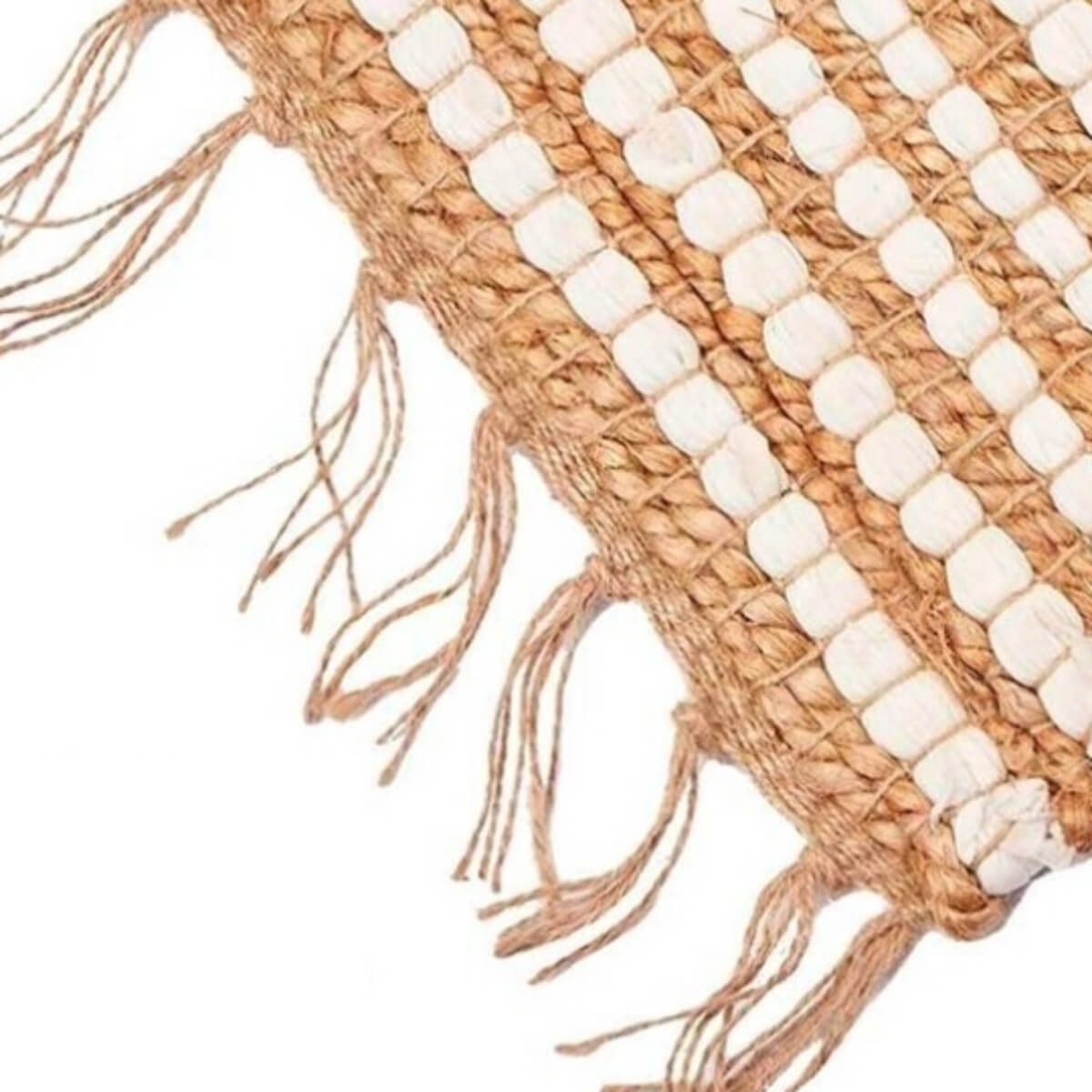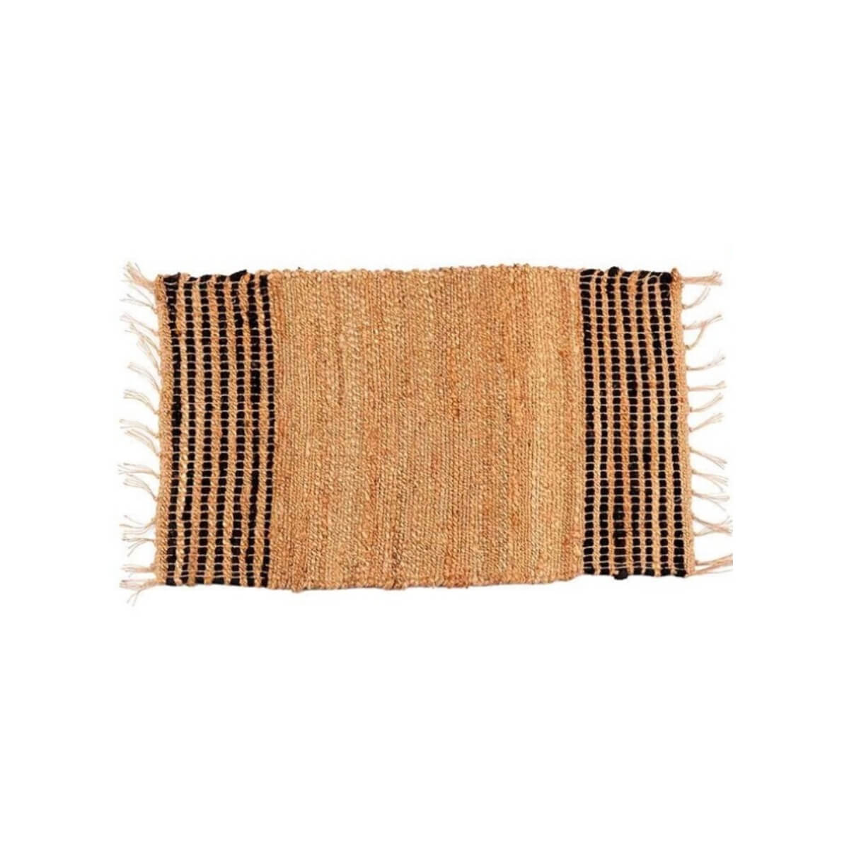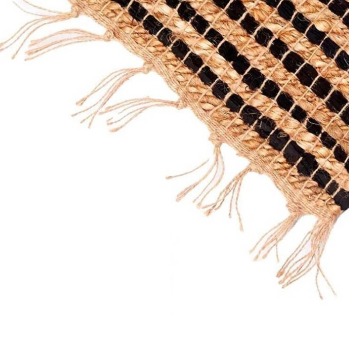Descripción: Alfombra fabricado en fibra natural con flecos en los extremos acabado en negro/blanco/natural rayas. Estilo Étnico.