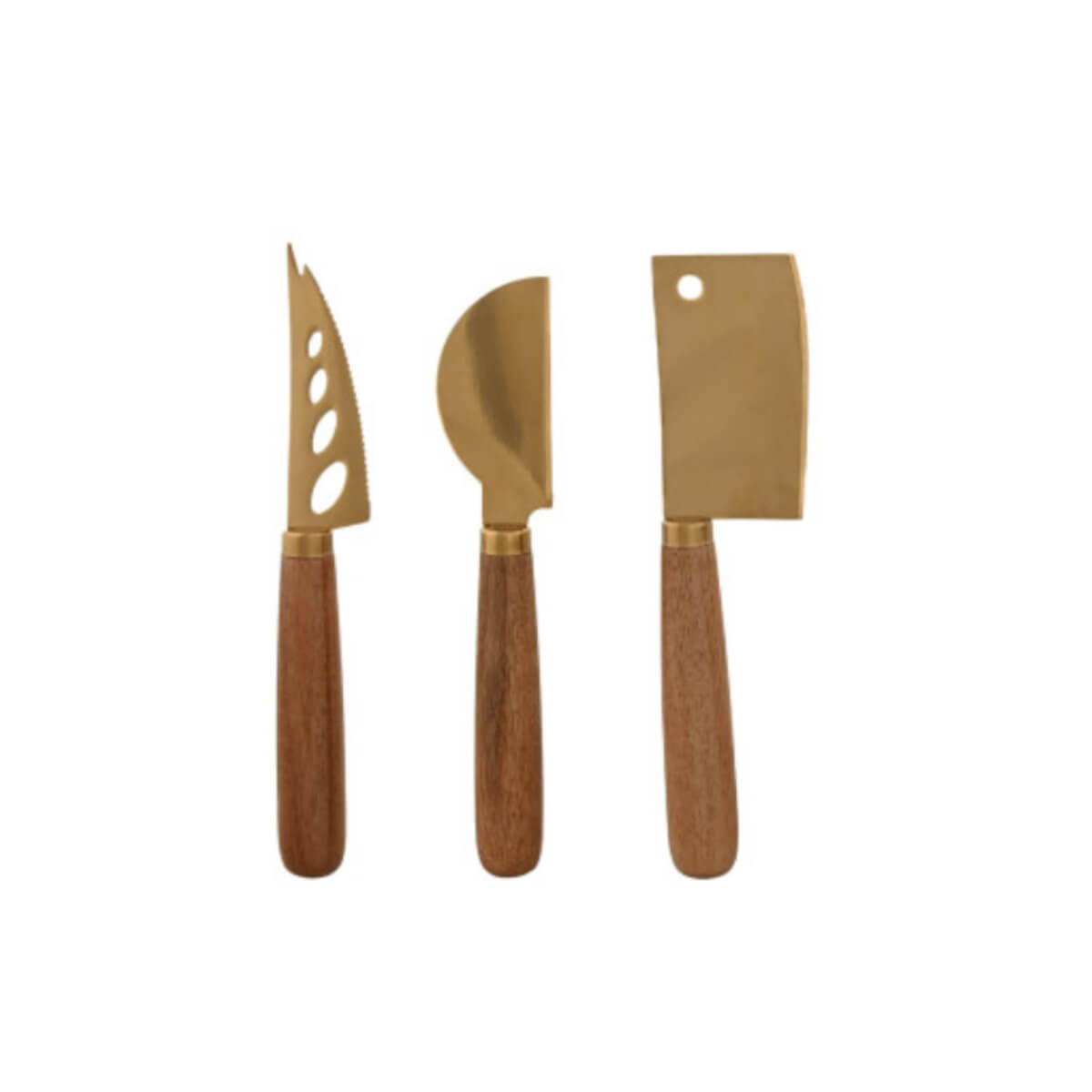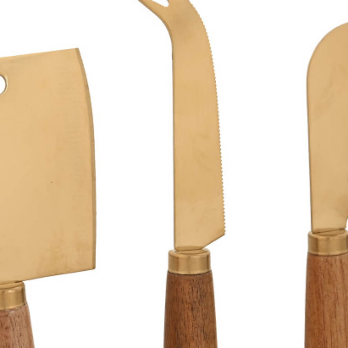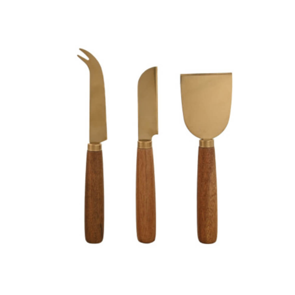 Descripción: Set/3 Cuchillos utensilios cortar queso, fabricado en acero inoxidable, con mango de madera acacia natural. Estilo Rústico. Dos modelos diferentes.